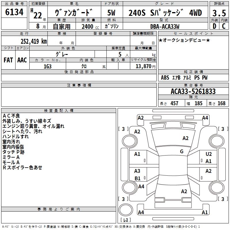 TOYOTA VANGUARD 240S S PACKAGE 4WD - лот 6134