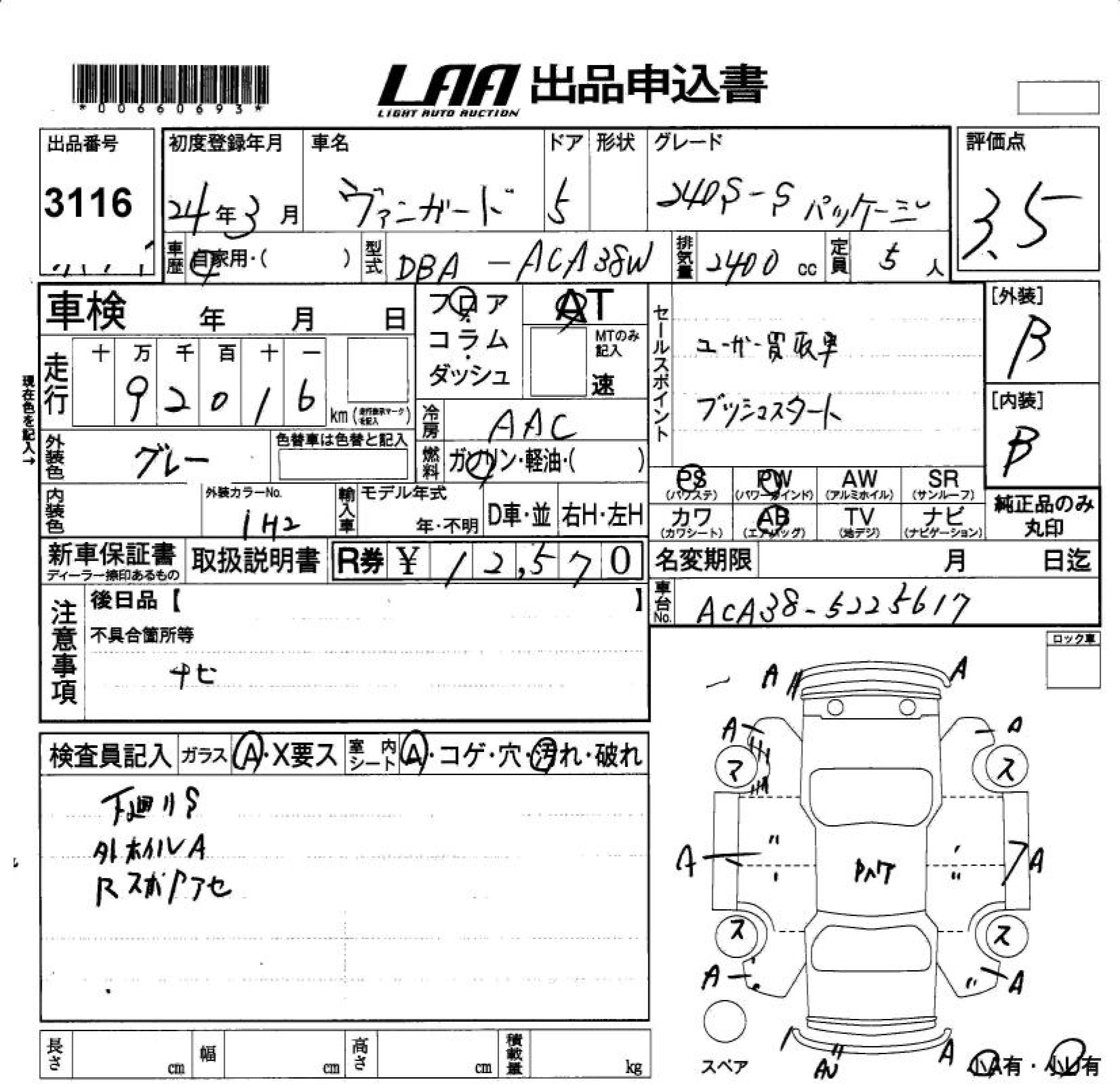 TOYOTA VANGUARD 240S S PACKAGE - лот 3116