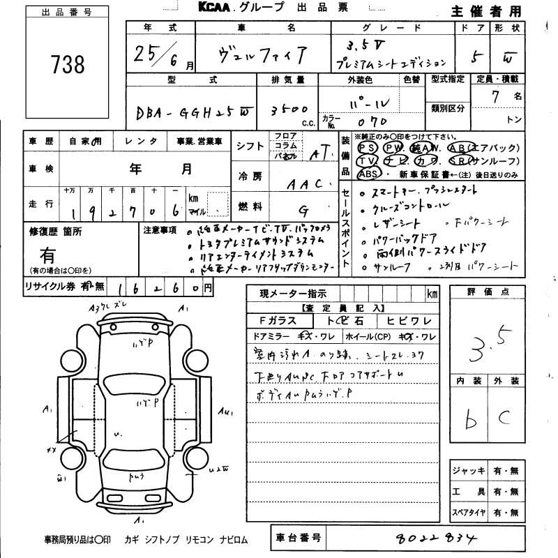 TOYOTA VELLFIRE 3.5V PREMIUM SEAT EDITION - лот 738