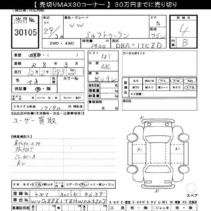 VOLKSWAGEN GOLF TOURAN - лот 30105